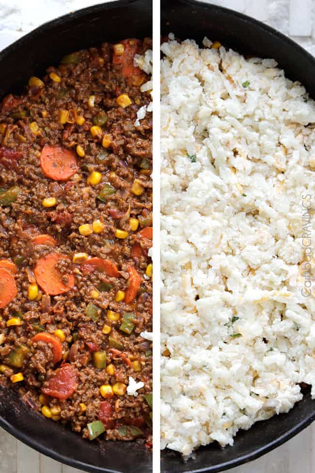 But you’ll want to stop eating, because, believe it or not, once you top the savory meat/vegetable layer with the creamy, cheesy hash brown layer and bake until crispy, golden deliciousness, it doesn’t get any better!