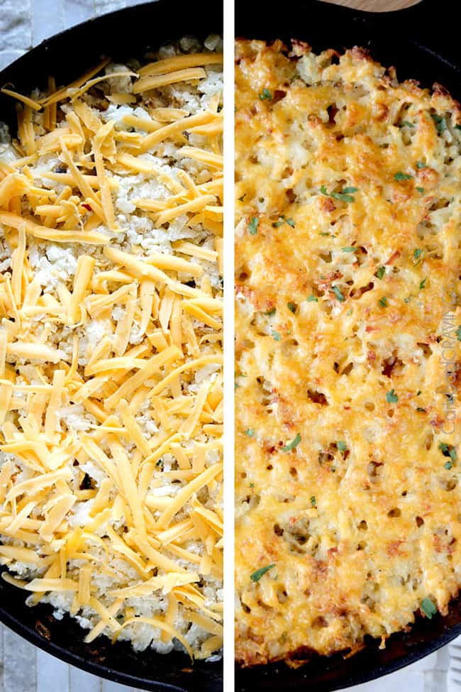 I made this and it was delicious! Made as is with one exception. Instead of frying the shredded potatoes, I baked them in the oven at 400 degrees, 30 mins, flipping half way through. Love hash browns, hate cooking them, splatters, messy, oily. Although they had great great flavor with the cheeses & sour cream, I felt, they were dry. Do you feel that baking them drastically changes the texture & not recommended? Filling was fantastic! The addition of hot sauce, genius! Never would have thought of adding that ingredient. My husband wants to know if you could do tater tots( minus cheese & sour cream)?