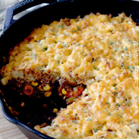 This easy Shepherd’s Pie recipe is layered with ground beef, carrots, corn and green peppers smothered in a tomato spiked brown gravy all topped with crispy, cheesy hash browns. It’s perfect comfort food for St. Patrick’s Day or an any day easy family favorite! I’ve also included instructions on how to freeze ground beef Shepherd’s Pie and how to make ahead!