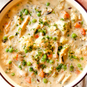 This creamy Chicken and Wild Rice Soup recipe is destined to become a new easy family favorite – and definitely one of mine! It’s creamy and flavorful loaded with juicy chicken, hearty wild rice, carrots, celery, cauliflower and peas for a symphony of texture in every bite -without any “cream of” soups. It’s also extremely versatile and pantry friendly – swap the wild rice for brown rice, the chicken for ground beef or sausage, and the veggies for your favorites. This Creamy Chicken and Rice Soup also reheats beautifully for make ahead dinner or lunches!
