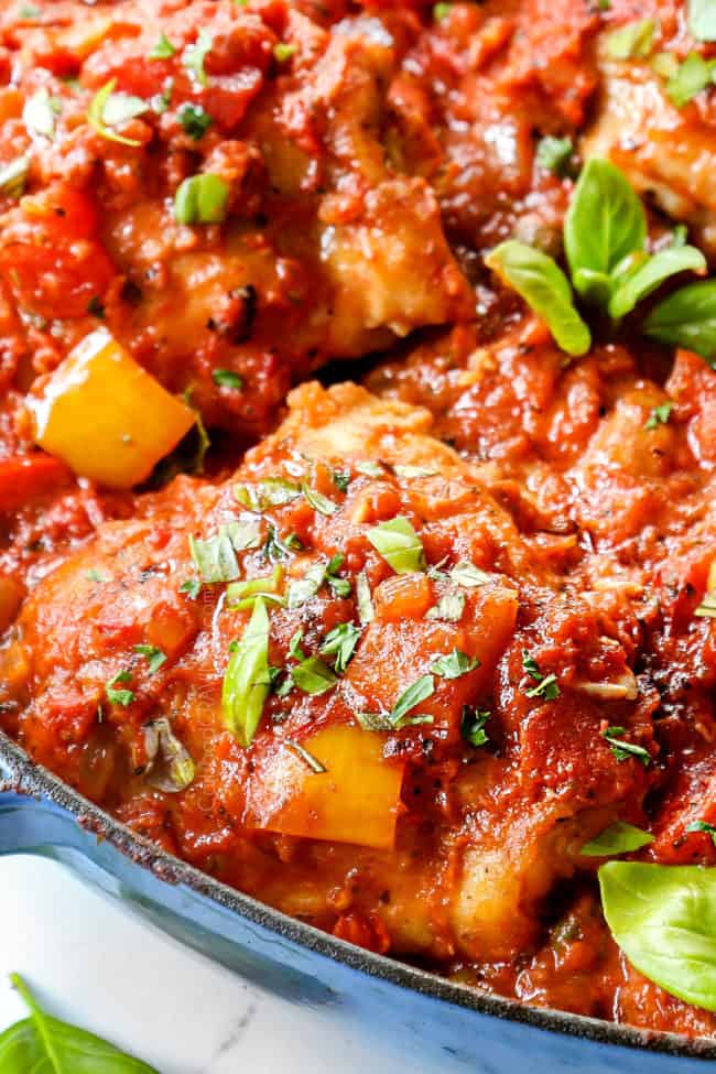 Classic chicken cacciatore is often referred to as a stew because the chicken (or rabbit) is slowly simmered until it literally is falling-off the bone directly into the sauce. Today, chicken cacciatore isn’t simmered for hours, so the chicken is still juicy, but not literally falling off the bone. You are welcome, however, to add chicken broth and simmer away!