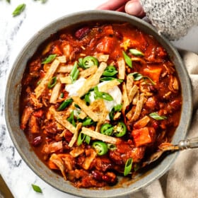 You can never have too many comforting chili recipes! If you love chili, don’t miss: crockpot beef chili, buffalo chicken chili, creamy white chicken chili, crockpot white chicken chili, easy turkey chili, and chipotle mango black bean chili (one of the first recipes I ever posted!).