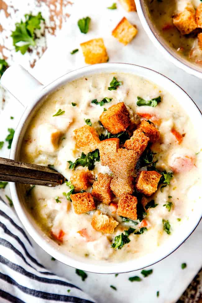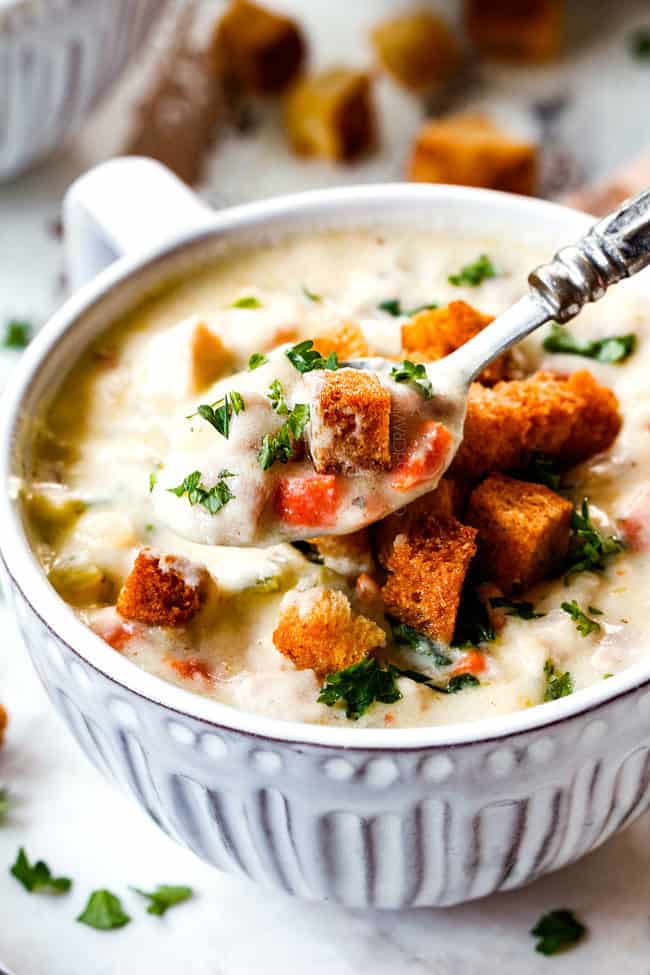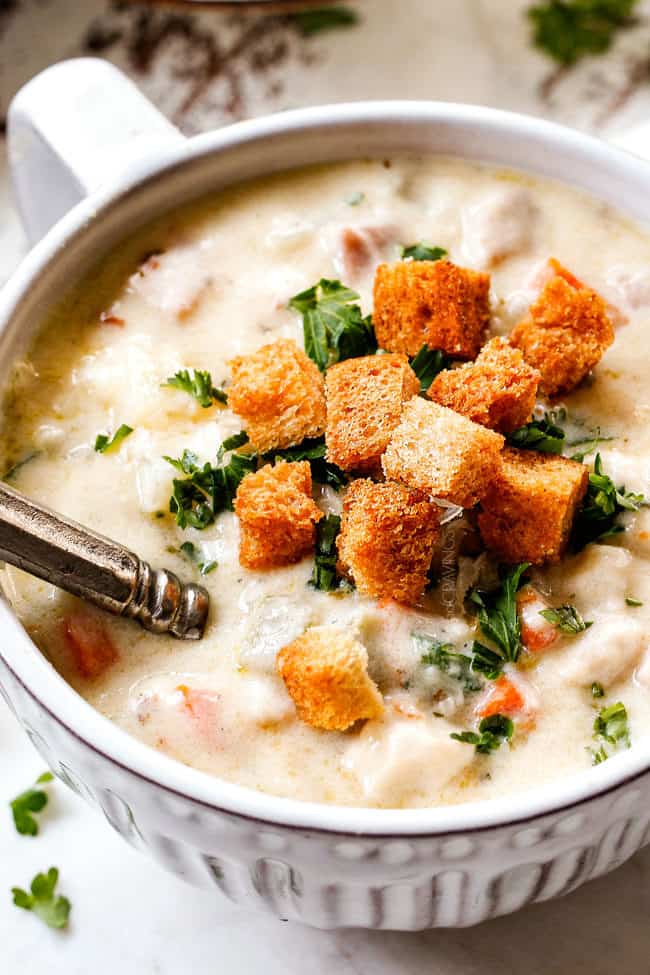 - Croutons: The croutons are optional but highly recommended. They are so tantalizing all on their own, it was hard to leave any for the soup! The croutons imitate the breading on Chicken Cordon Bleu and add a splendid contrasting crunch.
