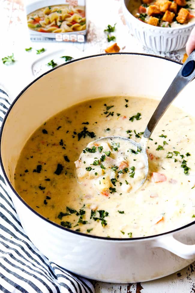 I hope you had a very Merry Christmas! Leftover ham is just one things I love about the holidays so I can make Breakfast Enchiladas, Eggs Benedict Casserole, White Bean Ham Tortellini Soup and now this Chicken Cordon Bleu Soup! And even if you don’t have leftover ham, I promise you are going to want to make this soup and it’s as easy as asking your deli counter for thick sliced ham (more on that below).