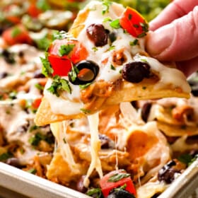 The best chicken for nachos is juicy shredded chicken that is a showstopper all on its own like this Honey Lime Salsa Verde Chicken, Crockpot Mexican Shredded Chicken, Chicken Tinga or Shortcut Mexican Chicken. Generally, shredded chicken is ideal because it doesn’t dry out as easily when baked.