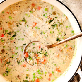To make crockpot chicken pot pie soup, you will use almost all of the same ingredients except omit the butter, olive oil and flour and increase the cornstarch. Please note that crockpot chicken pot pie soup won’t be quite as thick because liquid doesn’t evaporate while cooking like on the stove. Because of this, you want to consider replacing some or all of the half-and-half with heavy cream.