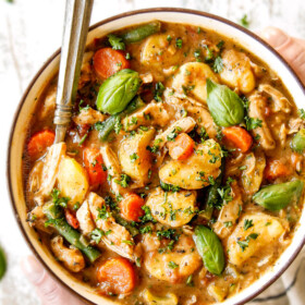 This Chicken Stew recipe is easy, hearty, warm, nourishing comfort in a bowl and SO good you’ll want to make it again and again! The Chicken Stew is loaded with juicy chicken, buttery potatoes, hearty carrots and celery, fresh green beans and aromatic onions, garlic and herbs swaddled in a rich, cozy gravy-broth. It’s a hypnotic tapestry of flavor and texture in every spoonful. This easy Chicken Stew recipe is also extremely versatile and pantry friendly – swap the chicken for ground beef or sausage, swap veggies or add more favorites, make it creamy, brothy or stew-like (all variations included). It also make ahead friendly (tips and tricks included) and stores and reheats beautifully!
