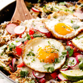 - Top skillet with eggs and desired toppings OR scoop servings onto plates and allow individuals to top their own. Serve Chilaquiles immediately as the chips will continue to soften the longer they sit.
