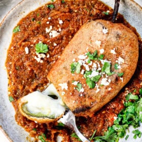 These cheesy chile rellenos are quick to make, impossible to resist, and rival your favorite restaurant! This recipe has been tested and perfected, elevated with seasoned batter, Oaxaca cheese, and roasted salsa ranchera. Follow along for expert tips, insider tricks, variations, and step-by-step photos in a chili relleno masterclass.