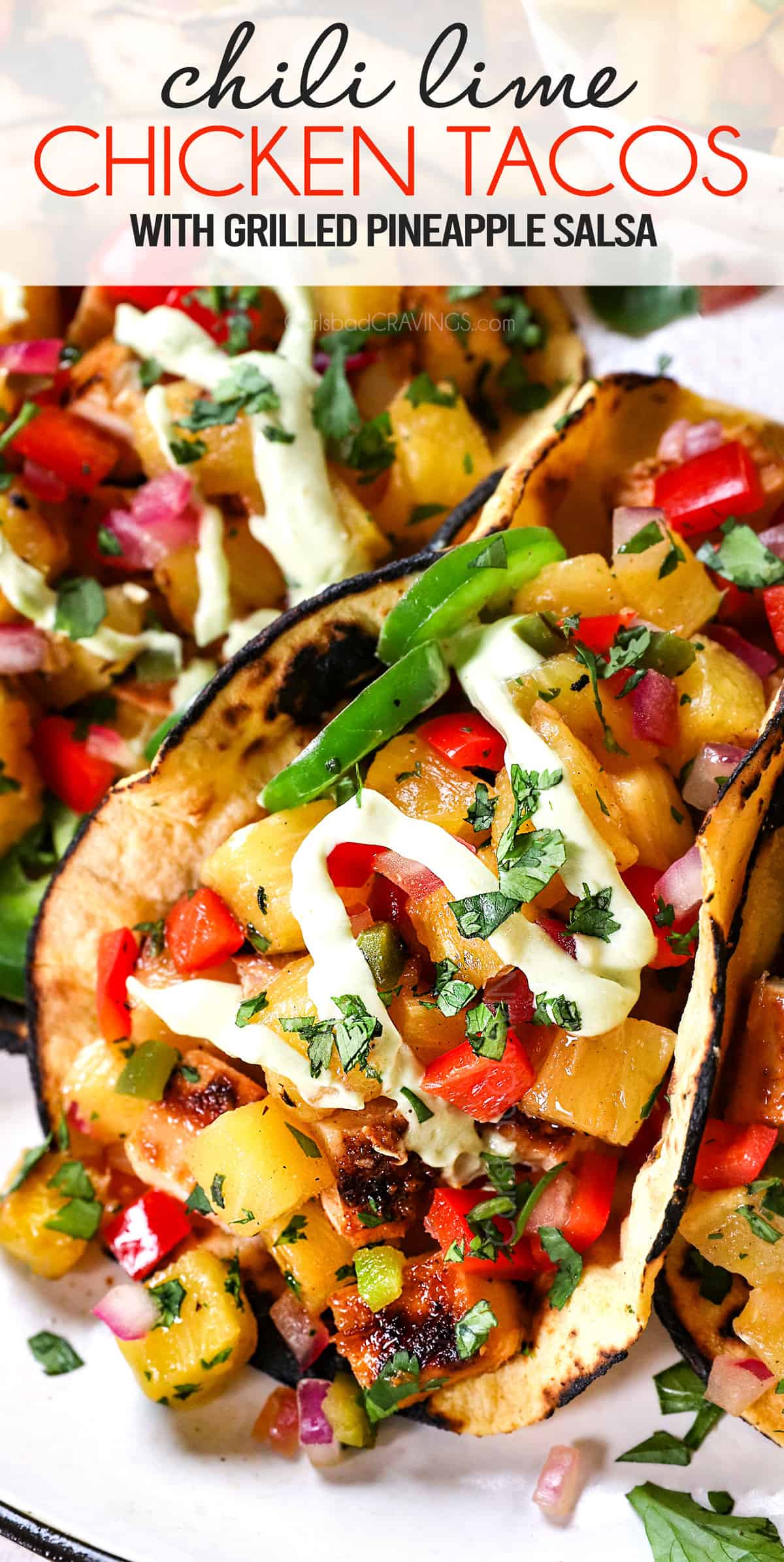 Chili Lime Chicken Tacos seeping with a rainbow of chili lime spices, topped with oozing Jack cheese, sweet and smoky Grilled Pineapple Salsa and drizzled with silky Avocado Crema.  Holiday worthy.  Every day easy.