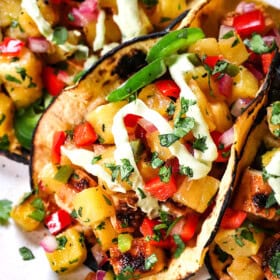 Chicken Tacos seeping with a rainbow of chili lime spices, piled with sweet and smoky Grilled Pineapple Salsa and drizzled with silky Avocado Crema might just become your favorite chicken taco recipe EVER! Readers call them: “absurdly good!,” “mouth watering!!” “AMAZING!” and “hands down the best tacos I’ve ever made and definitely some of the best tacos I’ve ever had.