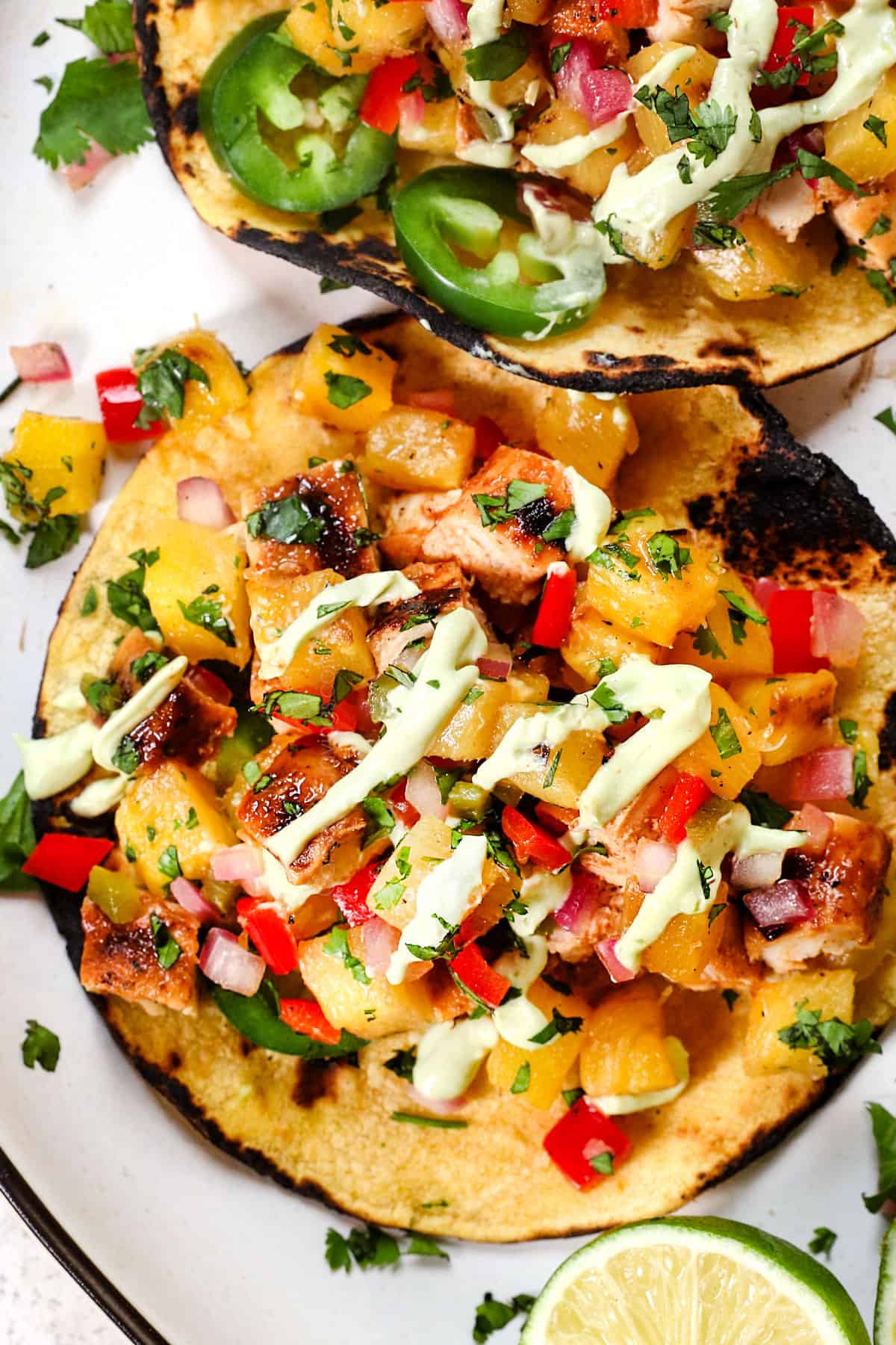 • Step 5: Assemble. Melt the cheese on the tortillas in the microwave or stovetop then top with Chili Lime Chicken, Pineapple Salsa followed by Avocado Crema. Dig in!