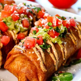 A chimichanga is like a burrito’s crispy, golden cousin! It’s a deep-fried, stuffed tortilla usually filled with seasoned meat, cheese, and beans, then topped with guacamole, sour cream, and salsa. Homemade recipes can also be baked or air-fried, like in this recipe, with shockingly crispy results!