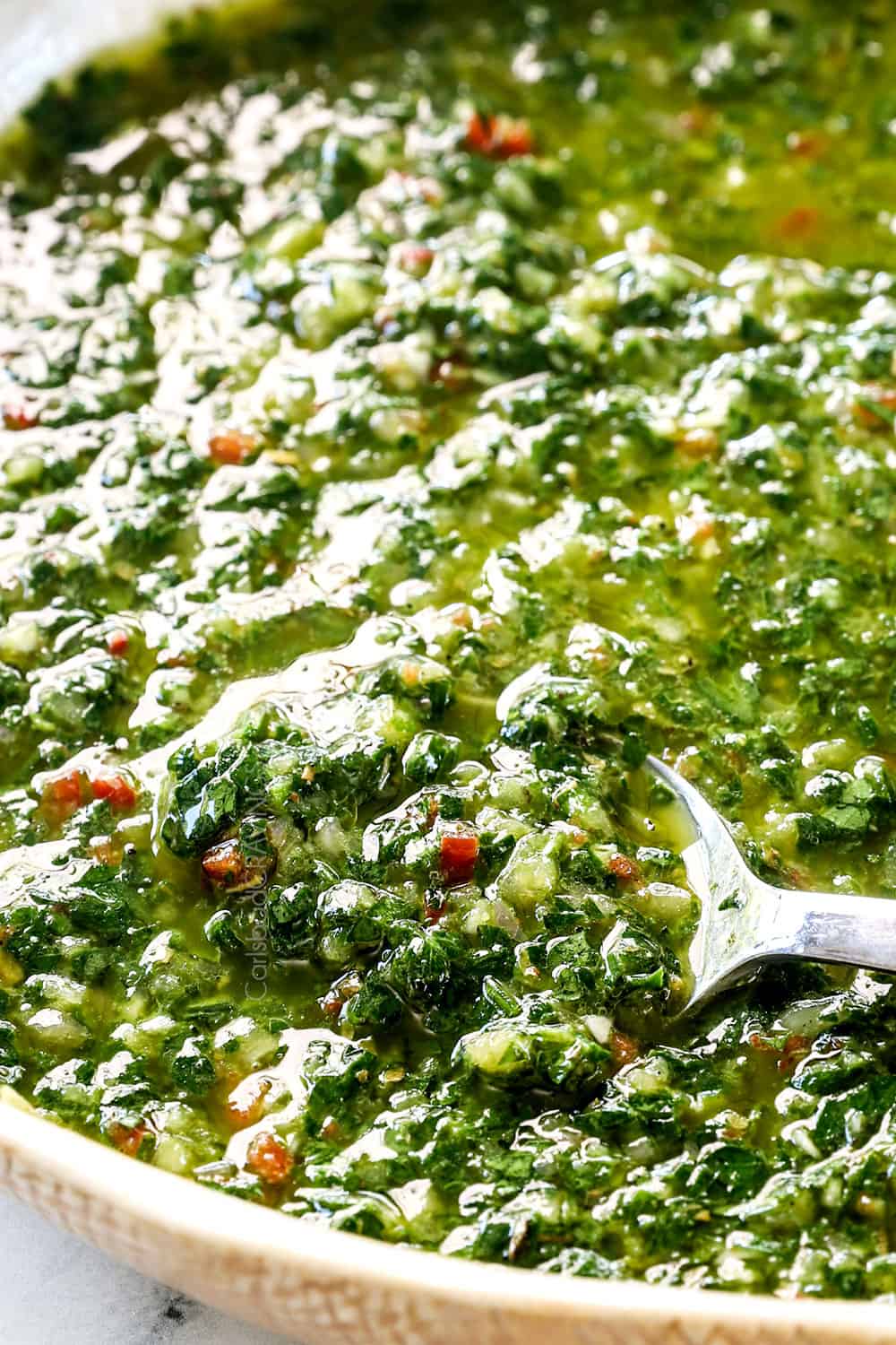A nod to chimichurri rojo: While green chimichurri (chimichurri verde) is the more well-known version of chimichurri in the states, you will also find a red chimichurri (chimichurri rojo) in Argentina as well. It is made with similar ingredients with the inclusion of roasted red peppers and smoked paprika which add the red color and a smoky flavor.