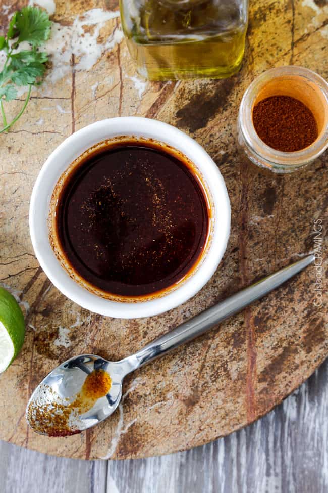 The spices are mixed with olive oil and lime juice to tenderize the meat so its oh so juicy and then slathered all over your chicken. Â Just look at those spices ready to create a fiesta in your mouth!