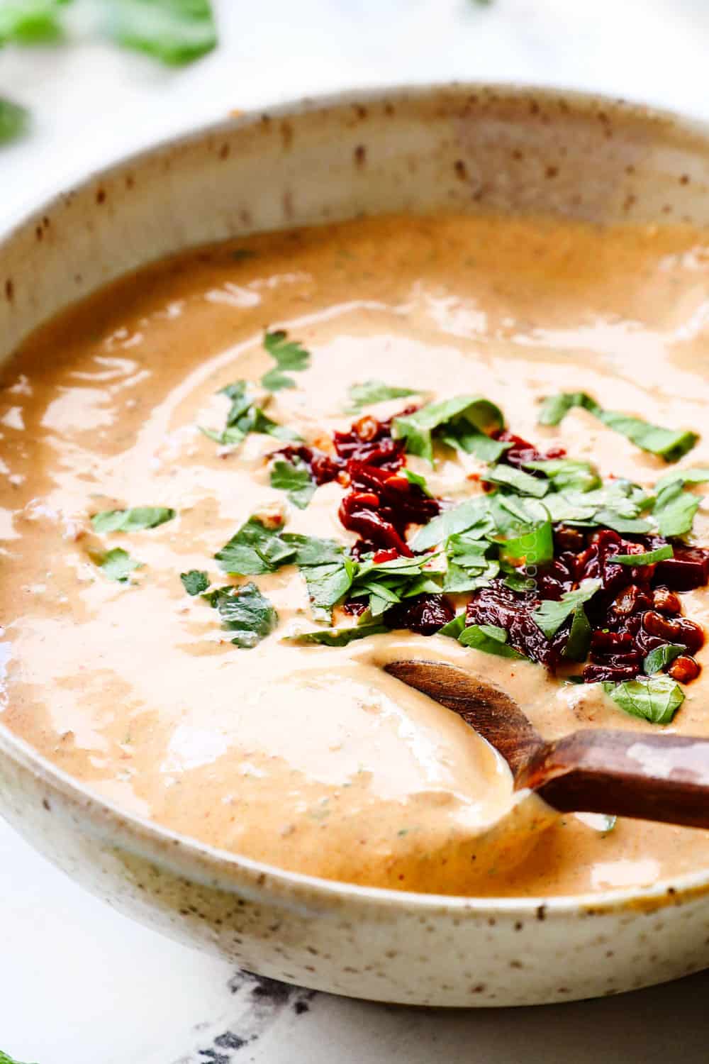 showing how creamy chipotle southwest sauce is by dipping a spoon in a bowl of the sauce
