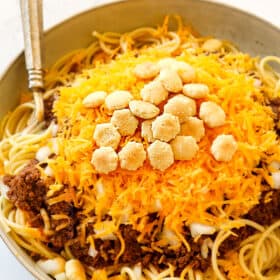To serve, the spaghetti and chili are topped with a pile of fluffy grated cheddar cheese (called a 3 way), or sometimes onions (4 way) and/or beans (5 way). The chili is also popular on top of hot dogs “Coneys” along with mustard, onions and a mound of cheese.