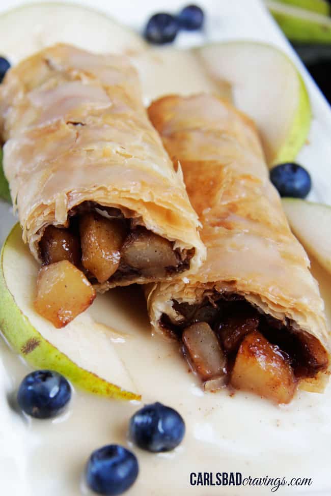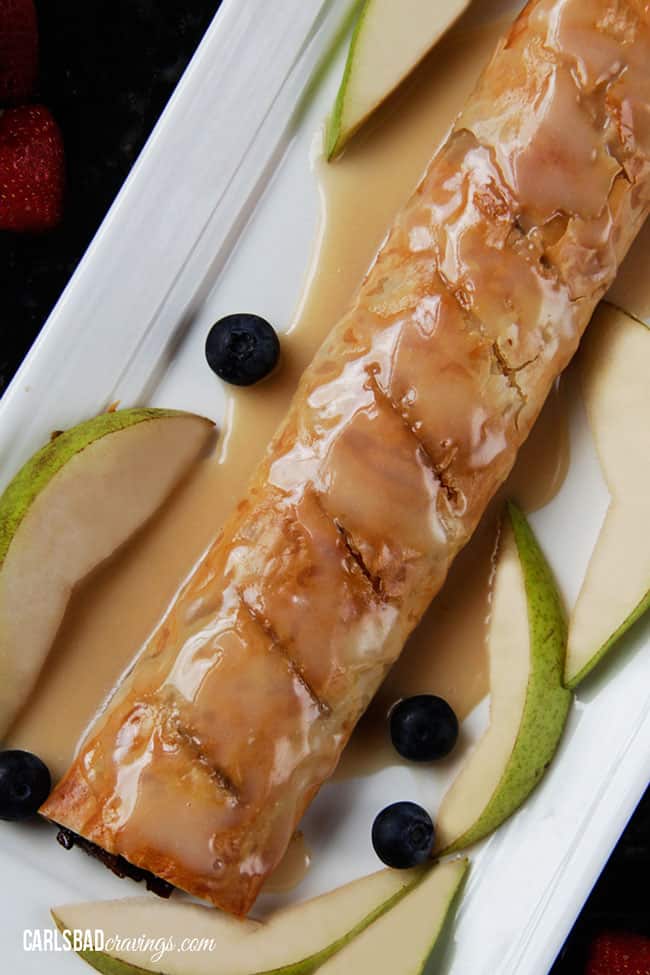 As equally impressive as the tantalizing strudel filling is how easy the dough is! The tender pears are rolled in phyllo dough (premade!) which is then brushed with butter and baked until golden, flaky and crispy.