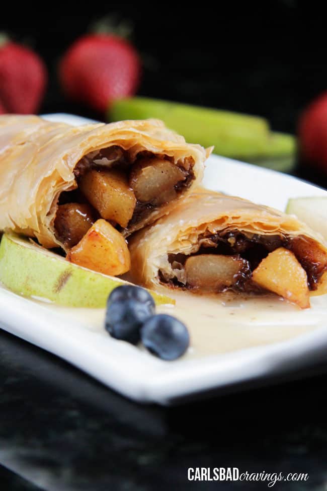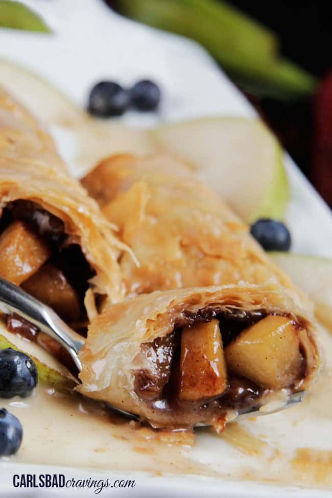 This Strudel is going to blow your mind! Apples or pears are sauteed with brown sugar, lemon juice, nutmeg and cinnamon then wrapped in a store-bought phyllo dough that is flaky, buttery and fool proof! This streamlined approach to making strudel is quick, easy, convenient and DELICIOUS! It eliminates the fear of making strudel and the hours!