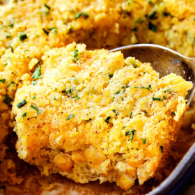 This Corn Casserole Recipe is one of our favorite side dishes not only for Thanksgiving and Christmas, but year-round! Corn Casserole is made with a buttery cornbread base infused with sour cream, buttermilk, cheese, creamed corn, corn kernels and chives to create an uber moist, creamy cornbread-like casserole with a soft golden crust that’s the perfect balance of savory, sweet, rich, creamy, and buttery; the dance of texture and flavor is heavenly! This cream Corn Casserole recipe is also ridiculously easy, MAKE AHEAD, customizable and belongs on your holiday table!