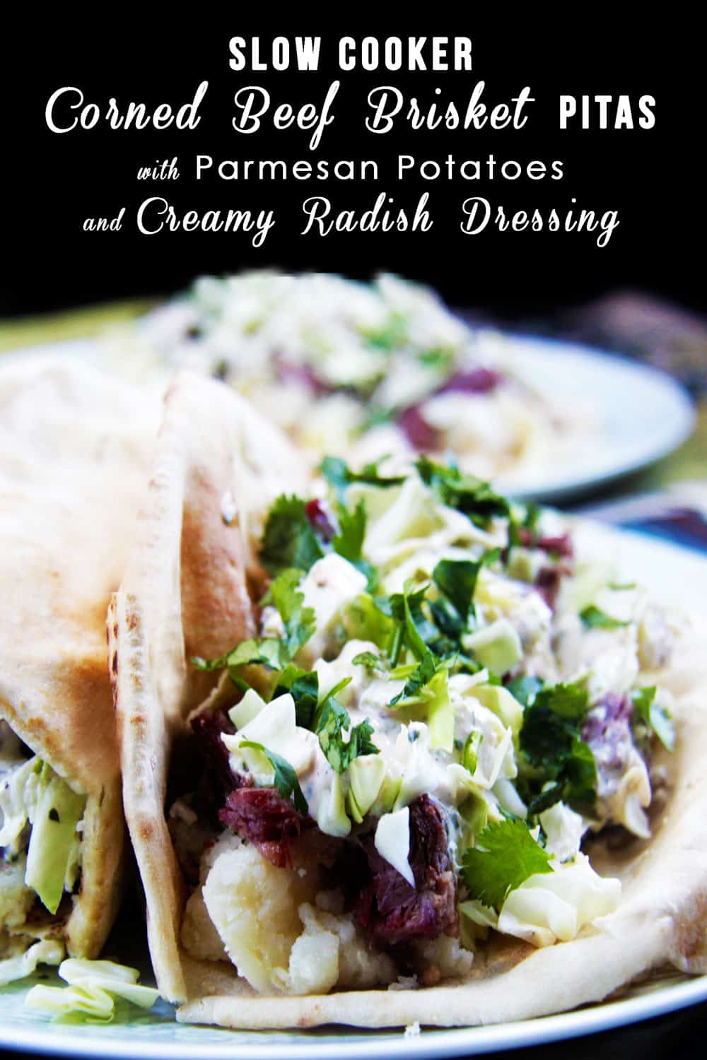 Corn Beef Brisket Pitas is a meal-in-one bursting with easy corn beef, Parmesan Potatoes, and Cabbage all smothered by Creamy Radish Dressing!
