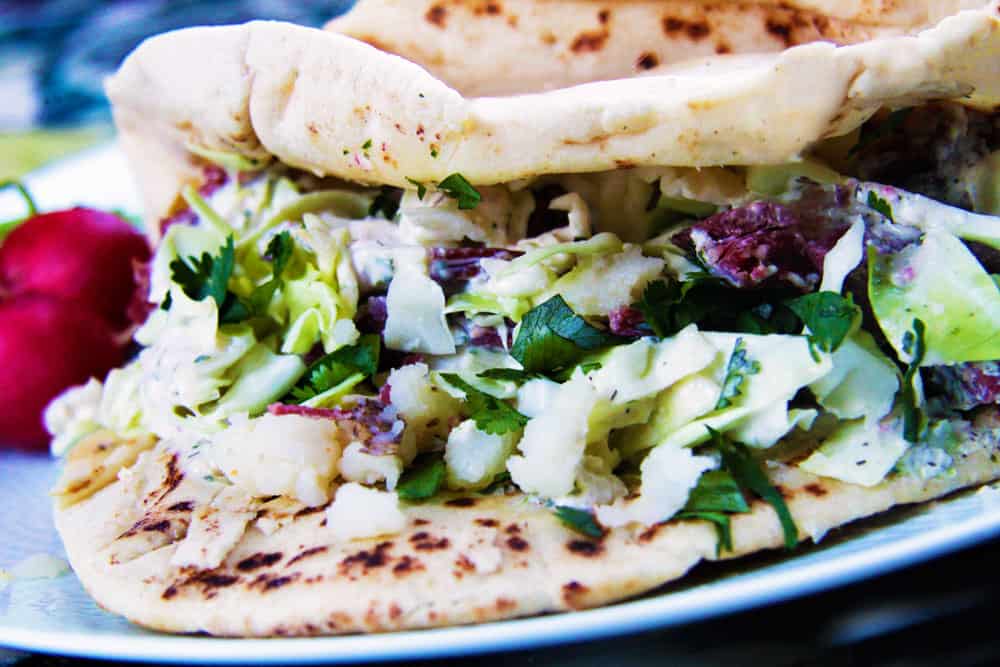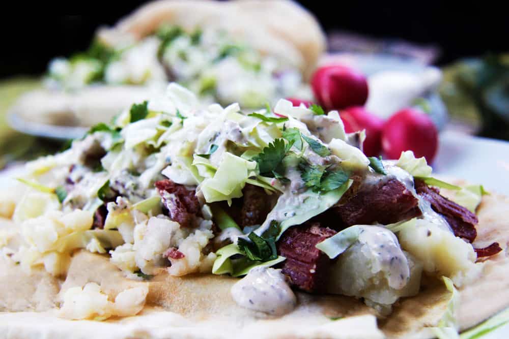 As flavorful as the potatoes are and as fall-apart-tender as the corned beef is, you might surprise yourself when the radish dressing is your favorite part of the meal. It is rich, creamy, tangy and enhances the flavors of all the other components of the pita – and again, it’s so easy! Simply place all of the ingredients in a blender, push your blend button and you’re done! So when its finally time to unearth the food behind the tantalizing smell that’s been tickling your nostrils and teasing your taste buds all day, you simply toast the pitas, mash the potatoes, slice the meat and that’s it!