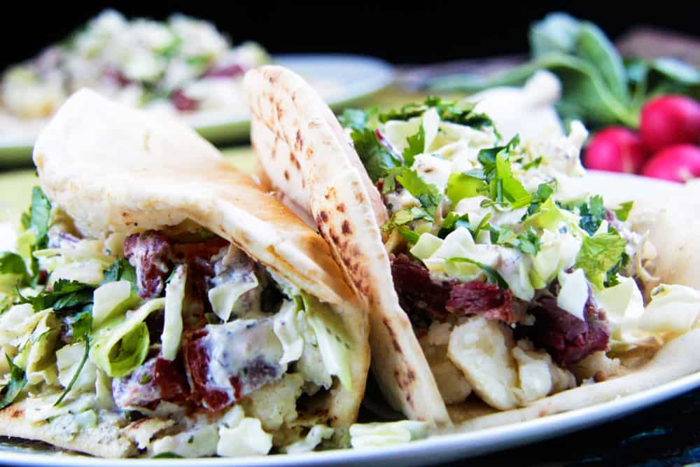 The layers of toasted pita, spiced corned beef, Parmesan mashed potatoes, crunchy cabbage and creamy radish dressing make every bite a savory dream! This feast of flavor might just have to be one tradition that happens more than once a year.
