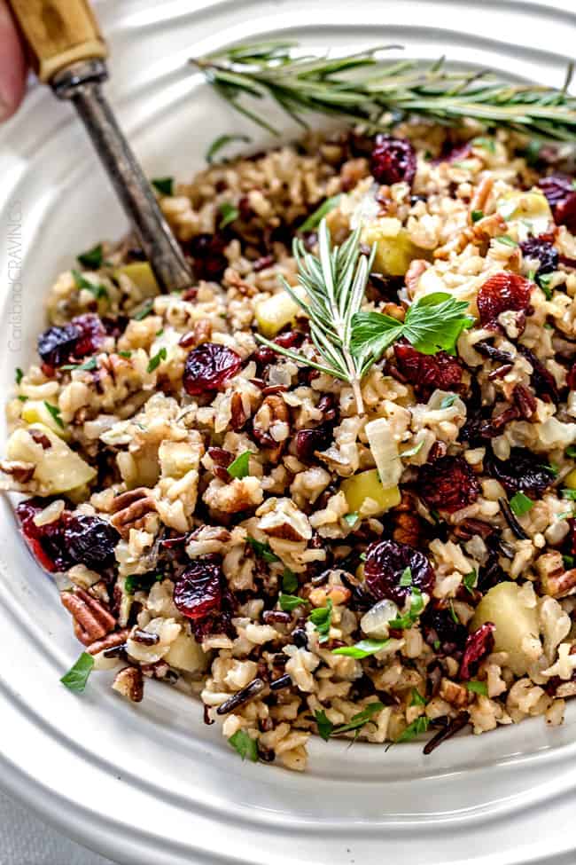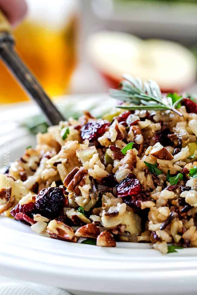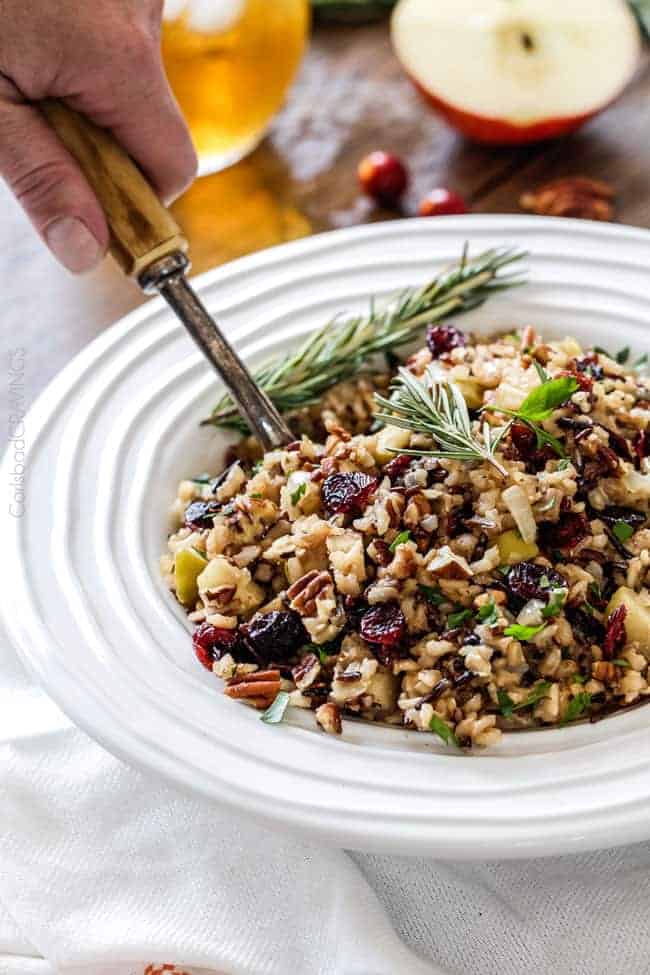 Wild Rice Pilaf simmered in herb seasoned chicken broth and apple juice and riddled with sweet dried cranberries, apples and roasted pecans for an unbelievable savory sweet side dish perfect for the holidays and easy enough for everyday!