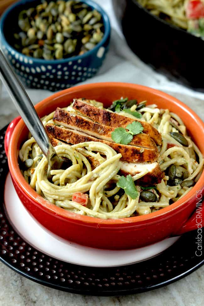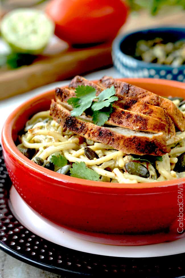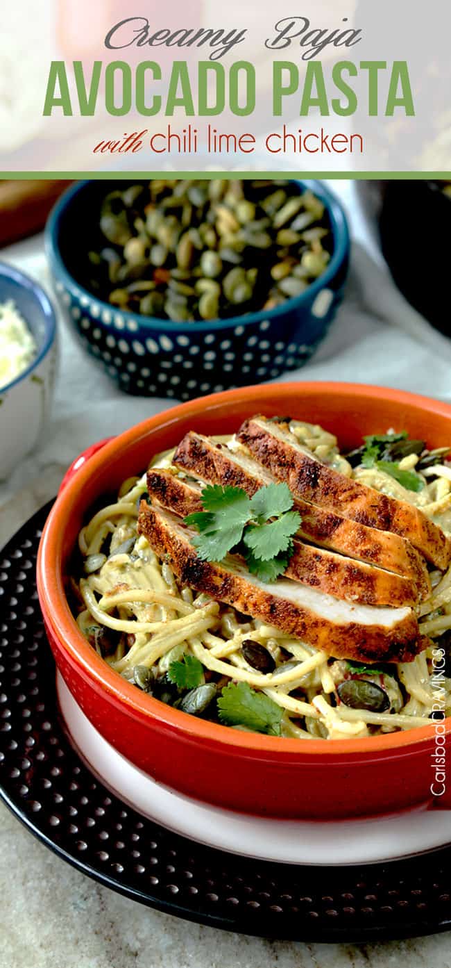 - Add Seasoned Chicken: This Avocado Pasta Sauce Recipe is even more delicious topped with Chilli Lime Chicken.  Fiestalicious tender chicken packed with flavor from an easy rub of your favorite spices of Baja and brightened by fresh lime juice and lime zest.  So crave worthy, I gave it its very own post. It makes everything better. Of course, the chicken is optional, but to me, this tantalizing juiciness is hardly optional.