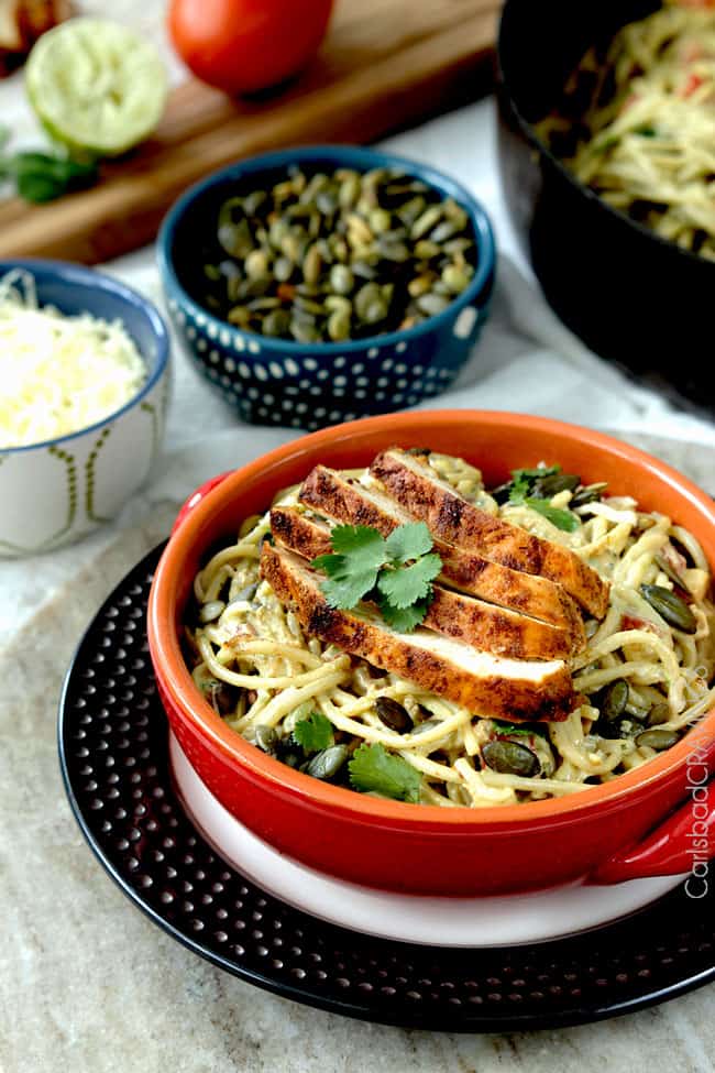 This Avocado Pasta Recipe is sooooo creamy, and sooooo healthy with the Best Avocado Pasta sauce ever! This quick and easy Avocado Pasta is completely customizable – leave it as simple as you want and slurp up the creaminess or add all sorts of veggies for texture heaven. This easy Avocado Pasta is spiced with the flavors of Baja and the option of Chili Lime Chicken, fresh sweet corn, bell peppers and pepitas – all on the table in less than 30 minutes!