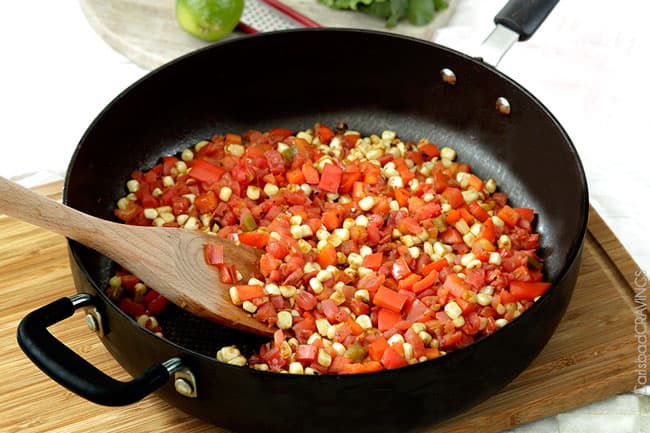 - In the same skillet you cooked your chicken in, heat 1 tablespoon olive oil over medium high heat (you can use remaining oil from chicken if there's enough). Add red bell peppers, corn and garlic and sauté 1-2 minutes, or until red peppers are crisp-tender. Add diced tomatoes/green chilies and heat through.