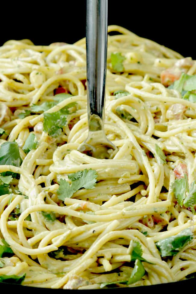 This  Baja Avocado Pasta is SO thick and creamy without any butter,  heavy cream or cream cheese.  So you don’t have to feel bad when you just can’t stop diving in mouth first.