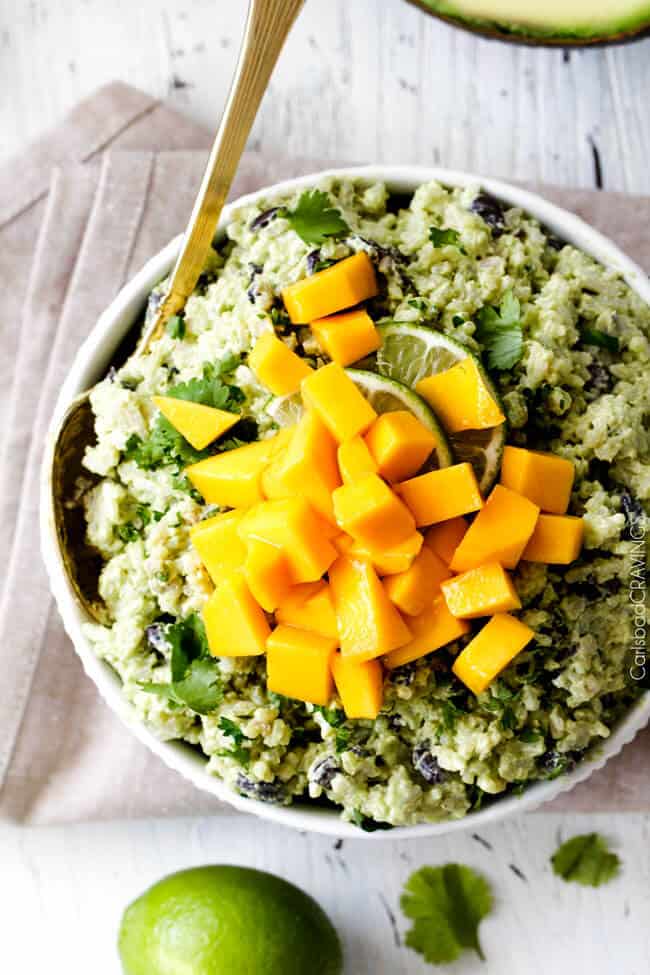 Creamy Cilantro Lime Avocado Rice with the option of mangoes and black beans is the most addictingly delicious Mexican side that makes every meal better or just add some chicken for a complete dinner!