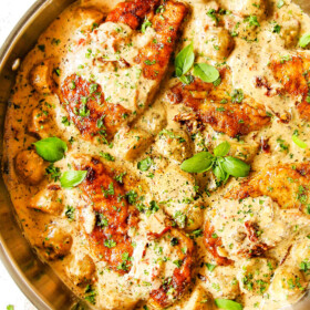 Creamy Tuscan Chicken swaddled in a sun-dried tomato, Parmesan garlic cream sauce on your table in just over 30 minutes!