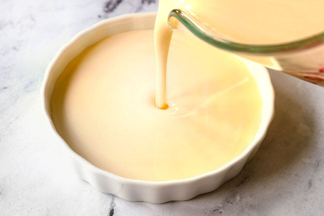 - Transfer the custard to a liquid measuring cup (or pitcher) so it’s easy to pour. Divide the custard between 6-8 ramekins (depending on size).