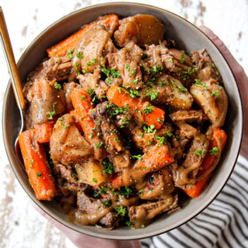 Cooking these cuts low and slow breaks the down the collagen which turns into gelatin tenderizing the meat so it’s fall apart tender and bursting with rich flavor. The beef further releases its juices into the broth, which combines with flour to create deeply flavorful gravy.