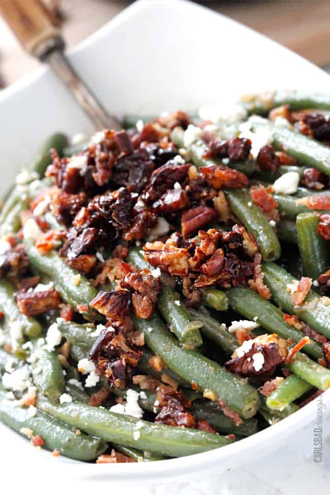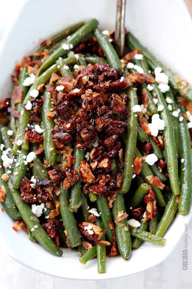 Move over, green bean casserole, there is a new exquisitely beautiful and exquisitely delicious green bean side in town. And it goes by Dijon Maple Green Beans with Caramelized Pecans, Bacon and Feta. Not your grandmother’s green beans.