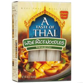 Your grocery store will probably sell thin rice noodles (vermicelli) and 1/4-inch-wide rice noodles, often called “Pad Thai” rice noodles. You’ll want to purchase the 1/4-inch-wide rice noodles or even wider if they have them.