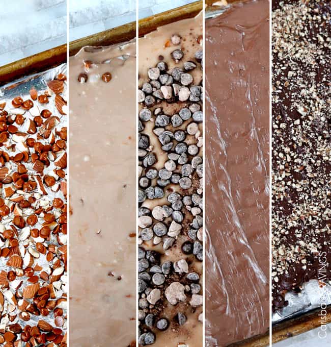 - Line a half baking sheet (18×13) with parchment paper or aluminum oil. Add almonds and spread out evenly. Roast in the oven at 350F degrees for 5 minutes. Sprinkle evenly with 1 cup chocolate chips then sprinkle with cinnamon. Set aside.