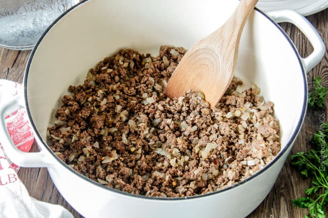 - Heat large Dutch oven/large soup pot over medium high heat. Add beef and onion and cook, stirring occasionally until beef is browned. Add garlic and red pepper flakes and saute for 30 seconds. Drain off any excess fat.