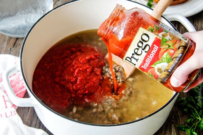 Then add all your remaining ingredients – Prego Traditional Italian Sauce, crushed tomatoes, chicken broth, spices…