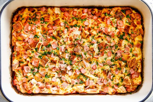 - The next morning, preheat oven to 375 degrees F and remove casserole from refrigerator and let rest at room temperature for 15 minutes. Remove plastic wrap then cover casserole tightly with foil. Bake for 30 minutes then uncover and continue to bake until a toothpick inserted into center of casserole comes out clean, about 15 – 20 minutes longer.