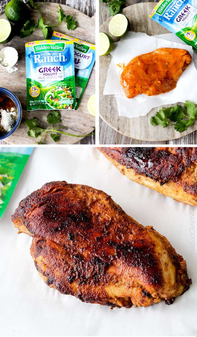 I kicked off the making of this Fiesta Ranch Chicken Burrito Bowl with Chipotle Avocado Ranch Crema with the newest, latest and greatest Hidden Valley Greek Yogurt Ranch Salad Dressing Mix by adding it to the Ranch Chicken Marinade along with a bevy of my favorite Mexican spices such as chipotle powder, chili powder, cumin and smoked paprika.ย