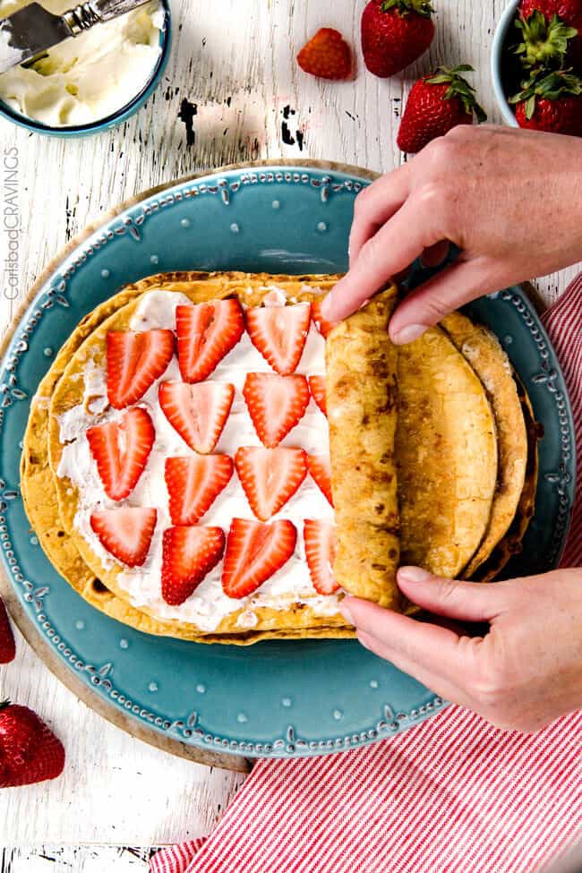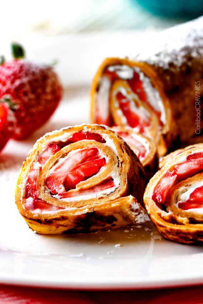 - At this point, you can roll up the French Toast Flatbreads and serve plain with syrup or fill with any of your favorite toppings – Nutella, peanut butter, coconut, bananas, blueberries, etc. and garnish with powdered sugar and syrup OR proceed to make the Strawberries and Cream below: