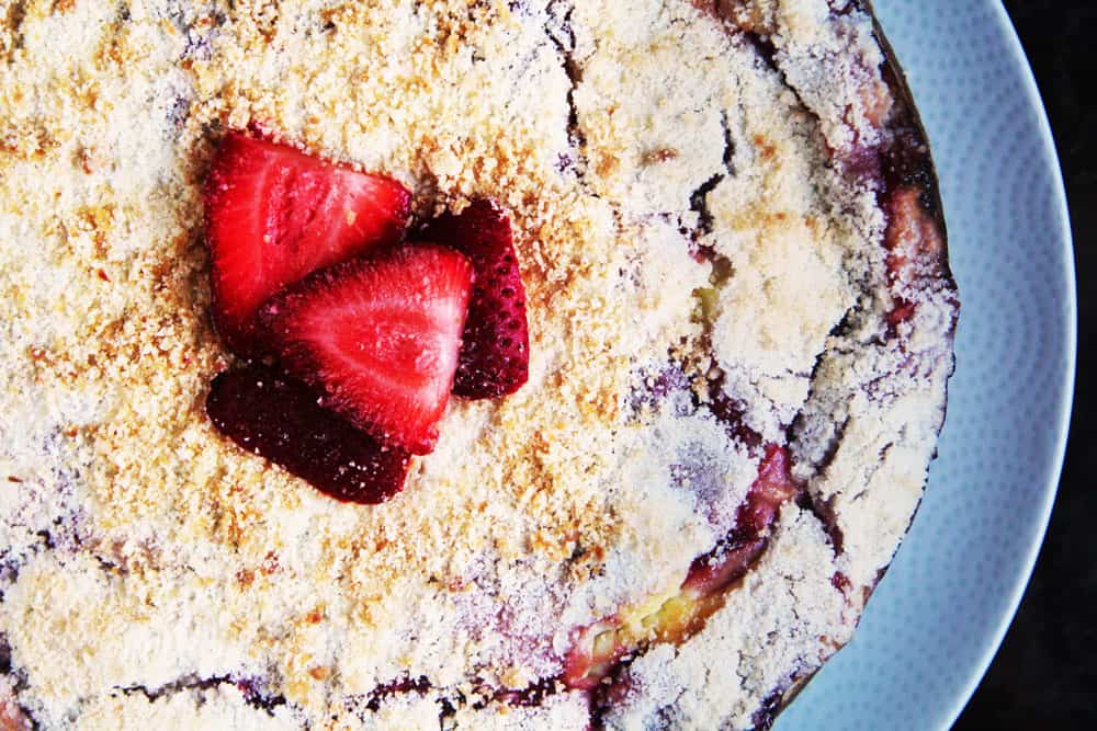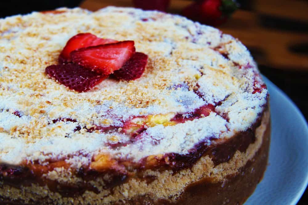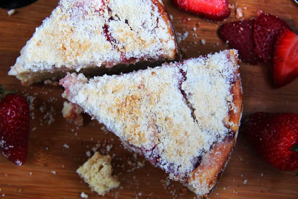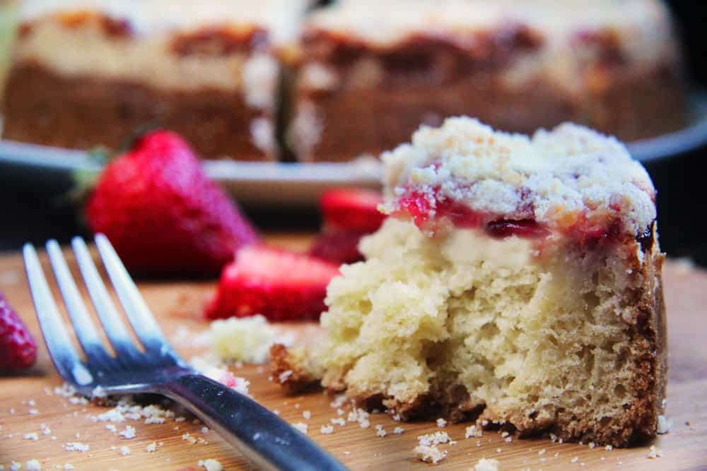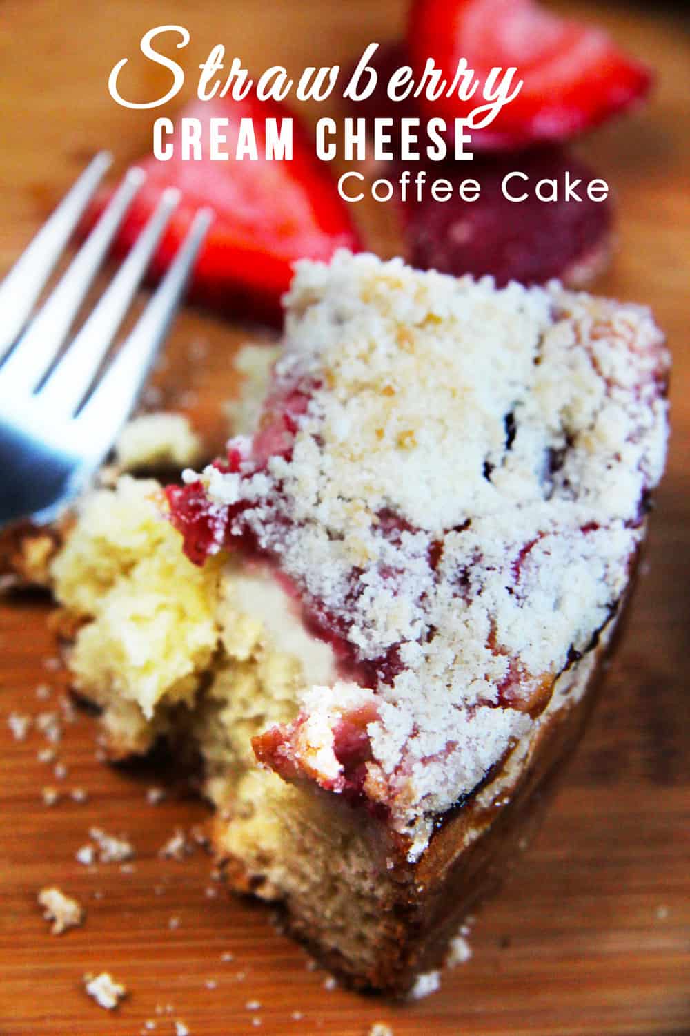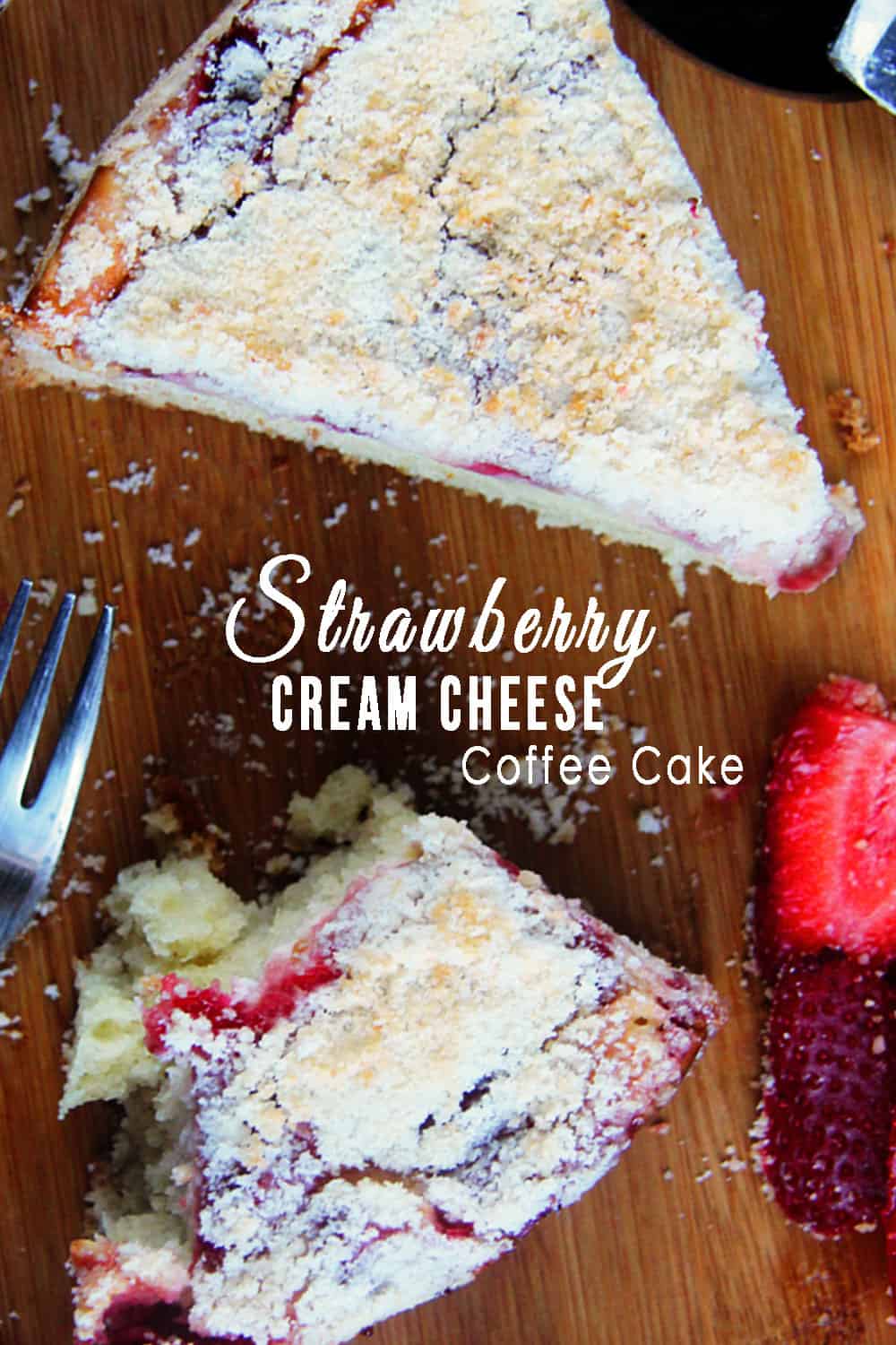 In the US, “Coffee Cake” has come to mean sweet breakfast cake typically with a crumb topping or streusel, as opposed to frosting, commonly served alongside coffee or tea at breakfast or brunch. So while, there is no coffee in this easy coffee cake recipe, there are strawberries and cream cheese!