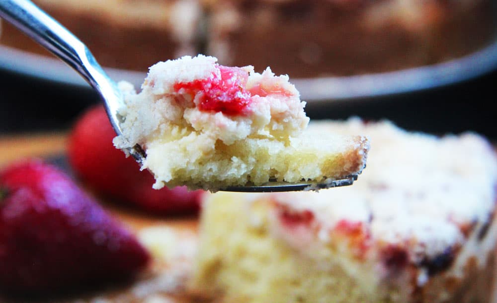 When I first posted this Strawberry Coffee Cake recipe, I received comment asking why it was called coffee cake if there is no coffee in the recipe? It turns out “Coffee Cake” is a popular American term but not so much abroad.