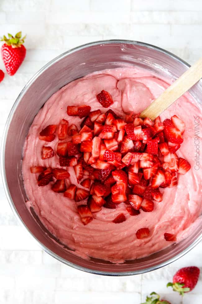- Turn off mixer and add vanilla extract, lemon extract and strawberries and gently fold into batter until combined. Spoon batter into prepared pan and tap pan on counter a few times to even and release air bubbles.