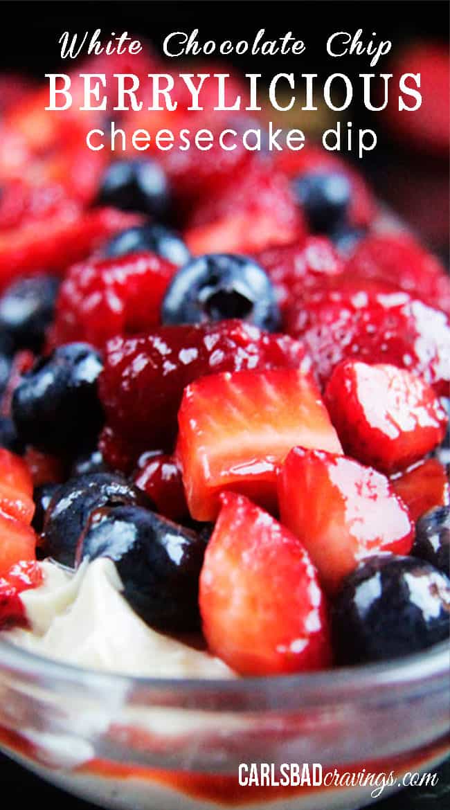 Favorite Carlsbad Cravings Flashback: White Chocolate Chip Berrylicious Cheesecake Dip. Creamy, easy, delicious, NO BAKE! And its BERRYLIIOUS! This would be perfect for 4th of July!