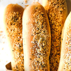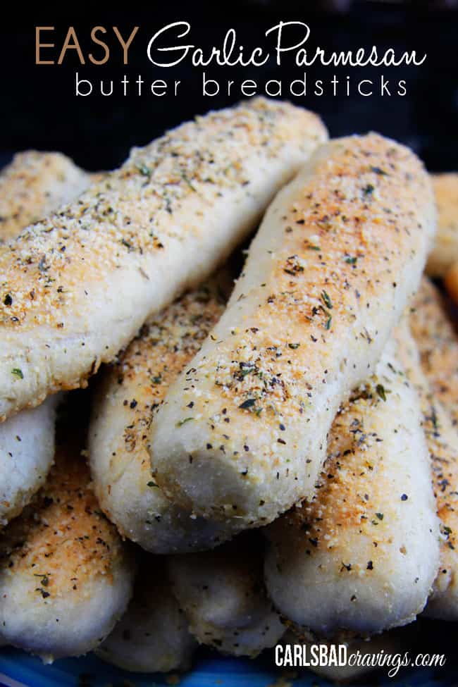 Breadsticks dusted with Parmesan, garlic and herbs that bake IN BUTTER, which means they are the epitome of addicting. These breadsticks are soft, buttery, melt-in-your-mouth tender and better than any restaurant’s (even Olive Garden’s!). They are also super EASY to make at home with only one 15 minute rise. We make these homemade breadsticks by the dozen for all our family gatherings, and they always disappear in a flash!  (Updated images and text from 2014)