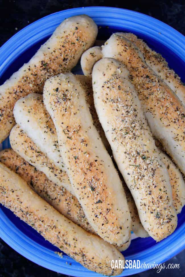 BUTTER, BUTTER, BUTTER: What sets these breadsticks apart is the fact they bake IN butter. Not only does this infuse them with butter so its not just a surface afterthought, but it also makes your life easier because you don’t have to brush each baked breadstick individually in butter afterward.